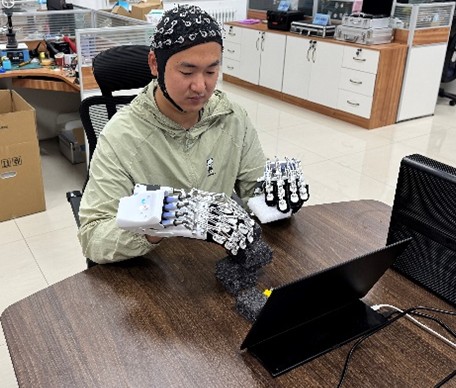 基于自主研發(fā)的輕量化可穿戴康復(fù)機(jī)械,開(kāi)發(fā)了基于腦機(jī)接口的腦控協(xié)同康復(fù)機(jī)械手系統(tǒng),并作為2025年世界機(jī)器人大賽-BCI腦控機(jī)器人大賽賽事平臺(tái)之一。該系統(tǒng)通過(guò)非侵入式SSVEP技術(shù),控制康復(fù)機(jī)械手完成抓握、捏取、雙手協(xié)作等動(dòng)作訓(xùn)練,促進(jìn)神經(jīng)功能重塑與運(yùn)動(dòng)功能重建。