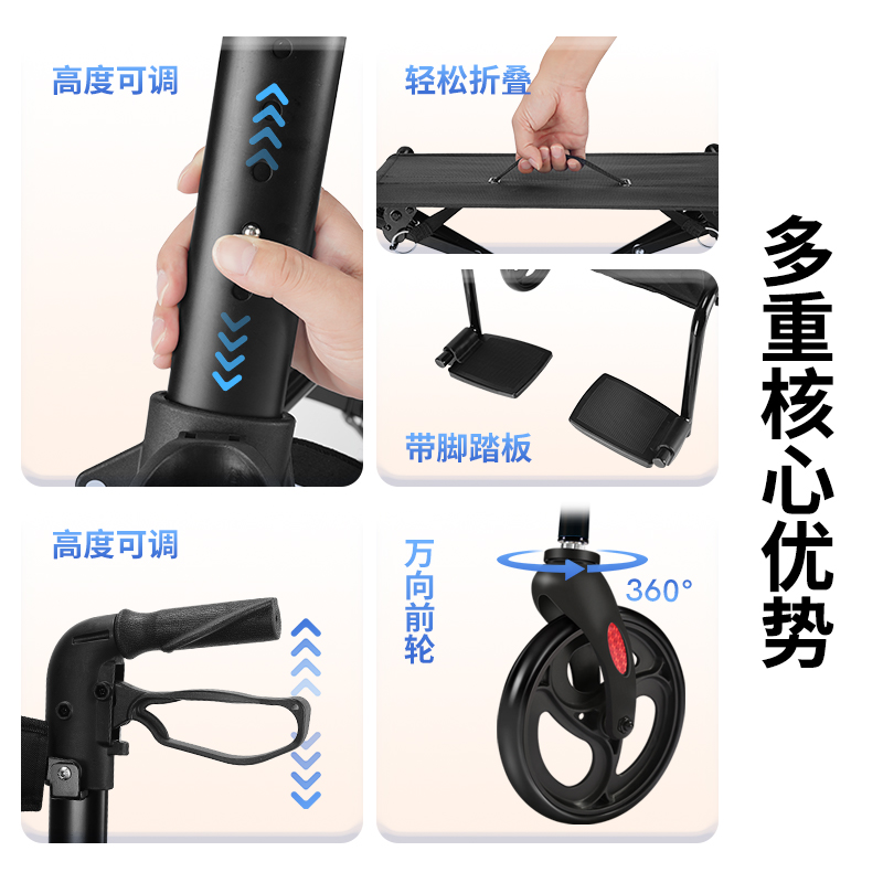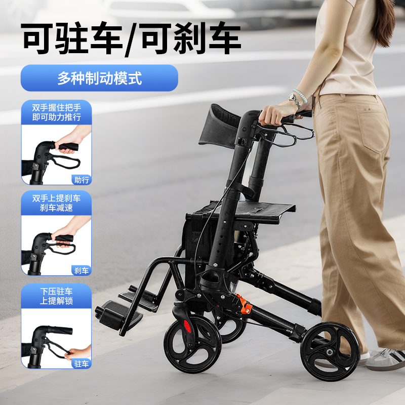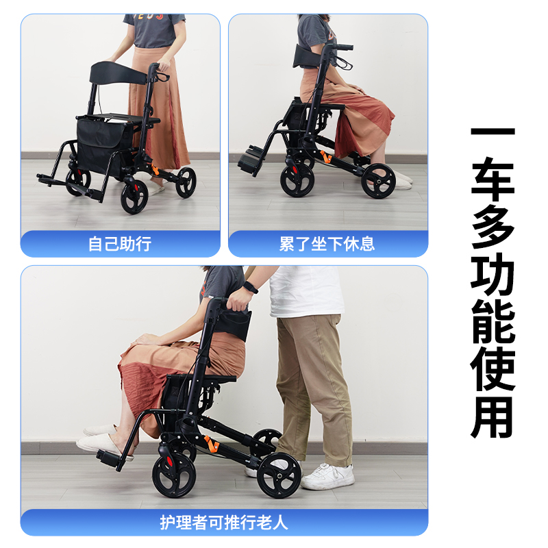 1、一車多用,輪椅、助行快速切換,可推可坐,走累了隨時坐下來休息。 2、高度可調(diào)節(jié),適用不同身高人群。8寸大PU輪,過坎更輕松 3、自帶駐車功能,安全放心,一秒折疊易攜帶。 4、適用老年人、腿部輕度受損患者、行動不便者。