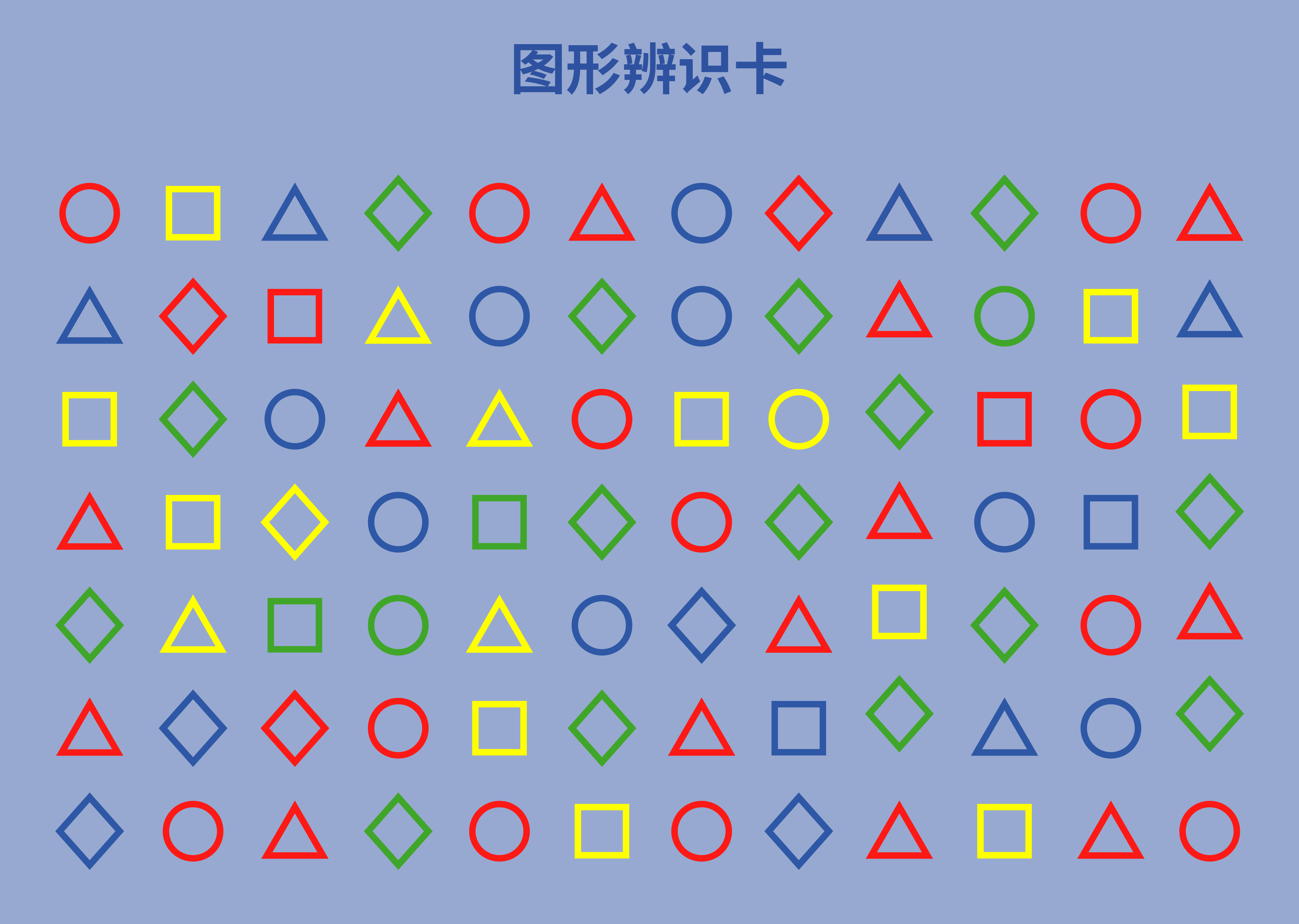 圖形辨識卡是一張訓(xùn)練卡,7行12列,上面分別以圓形、三角形、正方形、菱形,四種圖形呈現(xiàn)。它的游戲規(guī)則是當(dāng)遇到圓形時拍手1下,當(dāng)遇到正方形時拍桌子1下,當(dāng)遇到三角形時拍腿1下,當(dāng)遇到菱形時連拍手2下,訓(xùn)練循序漸進(jìn)展開,直到老年人能獨(dú)立完成整套訓(xùn)練卡游戲。通過圖形辨識卡,能有效鍛煉老人的手指靈活性,提升老人的空間感和反應(yīng)力,鍛煉大腦活力和認(rèn)知水平。