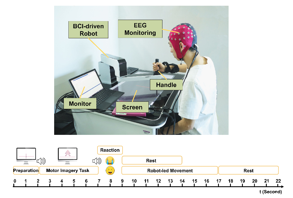 本項(xiàng)腦機(jī)交互技術(shù)實(shí)時(shí)解碼人體的運(yùn)動(dòng)意圖進(jìn)而實(shí)現(xiàn)控制外部設(shè)備執(zhí)行相應(yīng)的動(dòng)作。在康復(fù)訓(xùn)練過程中,患者可通過調(diào)動(dòng)自身的主動(dòng)運(yùn)動(dòng)意圖控制康復(fù)機(jī)器人牽動(dòng)偏癱側(cè)肢體執(zhí)行相應(yīng)的動(dòng)作,肢體運(yùn)動(dòng)反饋至大腦形成感覺,進(jìn)而影響下一次控制指令的發(fā)出,同時(shí),運(yùn)動(dòng)感覺反饋可有效的刺激大腦皮質(zhì),在神經(jīng)重塑和功能重建中發(fā)揮著重要的作用。腦機(jī)交互康復(fù)訓(xùn)練將神經(jīng)活動(dòng)和肢體的行為動(dòng)作建立了聯(lián)系,促進(jìn)患者正向的運(yùn)動(dòng)知覺的形成。同時(shí),該方法也在心理層面幫助患者重新建立信心,提高其參與康復(fù)訓(xùn)練的意愿和投入程度。
