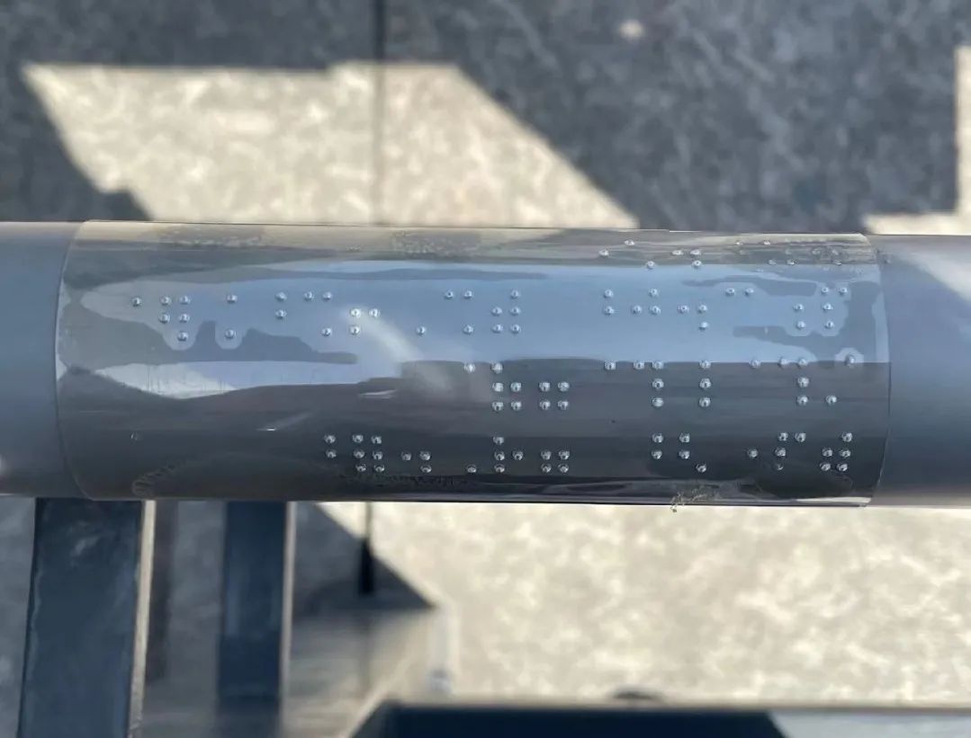 參觀團(tuán)來到市民中心門口,首先看到的是無障礙坡道。坡道的扶手上刻有盲文,能為視障人士提供行走路線信息。