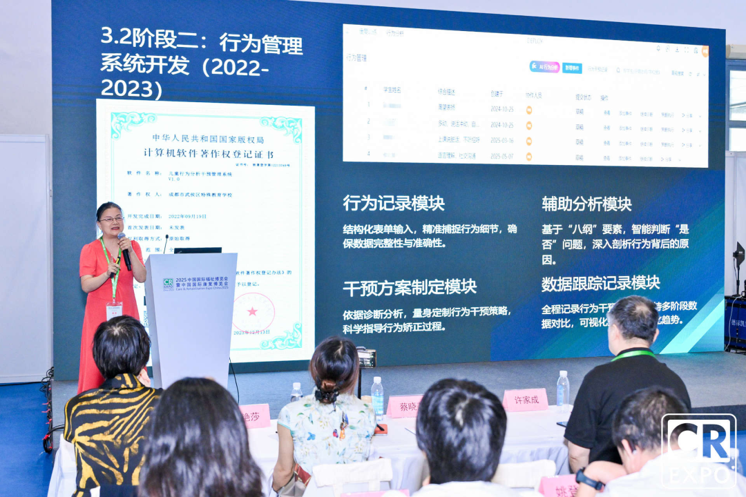 成都武侯特教學(xué)校的蔡曉莉校長分享了“基于行為綜合干預(yù)模型的AI智能體的創(chuàng)建與應(yīng)用”,介紹了他們學(xué)校基于特殊教育數(shù)字化轉(zhuǎn)型、人工智能技術(shù)應(yīng)用、行為干預(yù)理論體系的大背景下,特別是當(dāng)前行為分析工具不足、行為數(shù)據(jù)采集難題、傳統(tǒng)干預(yù)局限、缺乏系統(tǒng)化的數(shù)據(jù)分析平臺等行為干預(yù)痛點問題,創(chuàng)建了適合武侯區(qū)的武侯特色的行為干預(yù)綜合模型,經(jīng)過六年的研究與實踐歷程,構(gòu)建了智能服務(wù)平臺、資源支持平臺、協(xié)同服務(wù)平臺,并借助蔡曉莉名師工作室平臺開放共享。