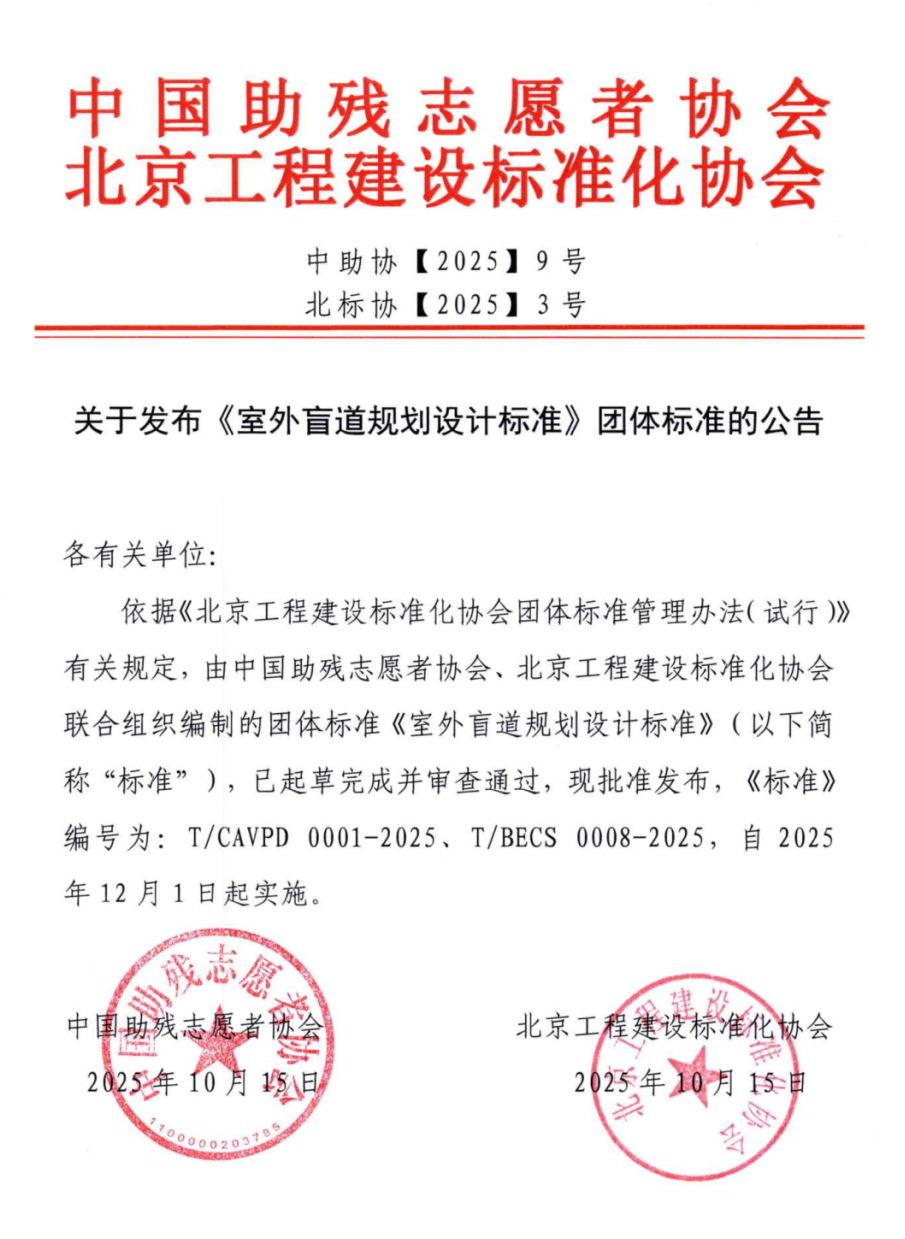 近日,在中國助殘志愿者協(xié)會的組織下,北京市城市規(guī)劃設(shè)計研究院(以下簡稱“北規(guī)院”)和北京市市政工程設(shè)計研究總院有限公司作為主編單位,北規(guī)院弘都規(guī)劃建筑設(shè)計研究院有限公司、北京市首都規(guī)劃設(shè)計工程咨詢開發(fā)有限公司等作為參編單位的團(tuán)體標(biāo)準(zhǔn)《室外盲道規(guī)劃設(shè)計標(biāo)準(zhǔn)》(T/CAVPD 0001-2025、T/BECS 0008-2025)(以下稱《標(biāo)準(zhǔn)》)正式發(fā)布,自2025年12月1日起實施。該標(biāo)準(zhǔn)填補了城市綠地、廣場等多類空間盲道建設(shè)長期無標(biāo)準(zhǔn)可依的空白,標(biāo)志著我國無障礙環(huán)境建設(shè)進(jìn)入新階段。