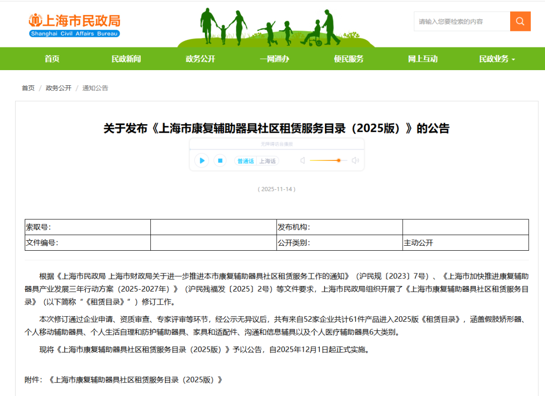 上海發(fā)布《康復(fù)輔助器具社區(qū)租賃服務(wù)目錄(2025版)》