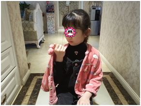 (3)梳頭訓練:腦癱兒童在前方有鏡子的地方坐下,如果抓握困難,可以選擇加粗梳子把柄,家長演示梳頭發(fā)動作使腦癱兒童模仿,或者輔助下讓腦癱兒童上肢舉過頭頂做來回環(huán)轉(zhuǎn)動作梳理頭發(fā)(如圖3-5)。