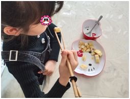 (2)進食:進食固體或半固體食物時,家長輔助下將食物盛入合適的碗里放在桌上,對于抓握較差的腦癱兒童,可以用繃帶固定手抓握勺子,家長一手輔助腦癱兒童前臂旋前、旋后,一手環(huán)轉(zhuǎn)腕關節(jié)將食物舀起送入口中(如圖1-3、1-4),反復練習,提高其進食能力。對于能力稍好的腦癱兒童,可以選取簡單改裝的筷子,如兩根筷子頂部用橡皮筋各纏繞兩圈固定的方式夾取食物進食(如圖1-5、1-6)。